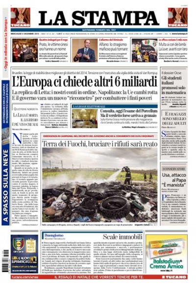 Le prime pagine di mercoledì 4 dicembre 2013