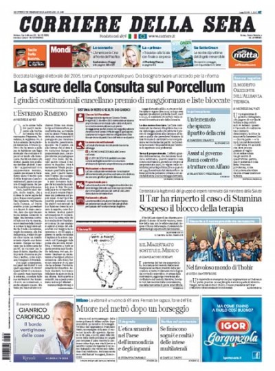 La notizia che apre quasi tutte le prime pagine di oggi, come prevedibile, è la sentenza della Corte Costituzionale sulla legge elettorale. Altre storie che si fanno spazio: la sentenza del TAR sul trattamento Stamina, le primarie del PD, le proteste degli agricoltori al Brennero. Sui giornali sportivi si parla parecchio di calciomercato e mondiali, più che di campionato di calcio e Champions League.