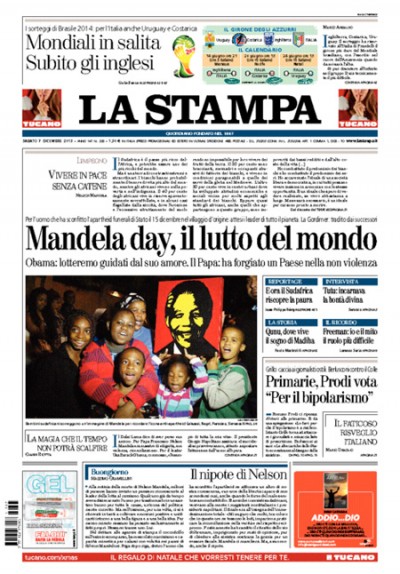 La maggior parte dei giornali di oggi dedica ancora l’apertura al ricordo di Nelson Mandela, ma anche la politica ha uno spazio rilevante: l’intesa fra Letta e Napolitano sulle riforme, l’attacco di Berlusconi alle alte cariche istituzionali, complici secondo lui del disegno della sinistra, l’annuncio di Prodi che andrà a votare alle primarie del PD, mentre il Giornale e Libero fanno l’elenco degli onorevoli “abusivi”, quelli eletti grazie al premio di maggioranza alla Camera, e l’Unità difende una sua giornalista attaccata da Grillo per gli articoli sul Movimento 5 Stelle. I giornali sportivi aprono con il sorteggio per i Mondiali di calcio in Brasile, che vede per l’Italia un girone impegnativo con Inghilterra, Uruguay e Costarica.