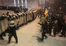 Piazza Indipendenza – il cuore delle proteste, dove sono accampate da giorni migliaia di persone – invece non è stata sgomberata, nonostante l’arrivo lunedì pomeriggio di centinaia di poliziotti in tenuta antisommossa. I poliziotti hanno bloccato le uscite della piazza e accerchiato i manifestanti. Alcuni di loro indossavano elmetti ed erano armati con lunghi bastoni, e ci sono stati scontri con gli agenti. Di notte la temperatura è scesa sette gradi sotto lo zero, e sia poliziotti che manifestanti hanno dovuto affrontare il gelo e la neve, caduta lunedì.
