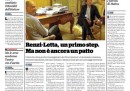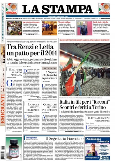 Quasi tutti i giornali di oggi dedicano l’apertura all’incontro di ieri fra il Presidente del Consiglio Letta e il nuovo segretario del PD Renzi, che si sono accordati sulle priorità da raggiungere nell’azione del governo, e sulla formazione della nuova segreteria del Partito Democratico. L’altra notizia a cui viene dedicato grande spazio è quella sulle manifestazioni dei “forconi”, che hanno provocato anche scontri in qualche città ieri, e sul gesto di un gruppo di poliziotti che si è levato il casco davanti ai manifestanti come gesto distensivo.