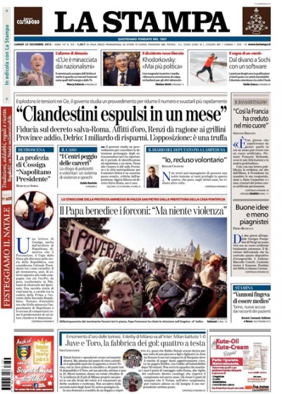 I giornali di oggi hanno notizie diverse in apertura: Repubblica e il Secolo XIX titolano con il piano per il lavoro del neo segretario del Partito Democratico Renzi, il Corriere della Sera apre con il voto di fiducia previsto per oggi sul decreto “salva Roma”, la Stampa e l’Unità si occupano dell’intenzione del governo di modificare le norme sull’immigrazione e della situazione nei centri di accoglienza, il Messaggero e il Mattino titolano ancora sulle tasse sulla casa, e il Giornale attacca il ministro Kyenge. I quotidiani sportivi aprono con i risultati della domenica calcistica e le vittorie di Juventus, Roma e dell’Inter nel derby di Milano.