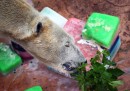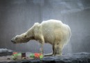 Inuka è il primo orso polare nato nei Tropici: vive nello zoo di Singapore e oggi, 26 dicembre, compie 23 anni. Per l’occasione il personale dello zoo gli ha preparato una torta fatta di blocchi di ghiaccio in cui sono intrappolati pezzetti di salmone, mele, bacche, panna montata e foglie di gelso.