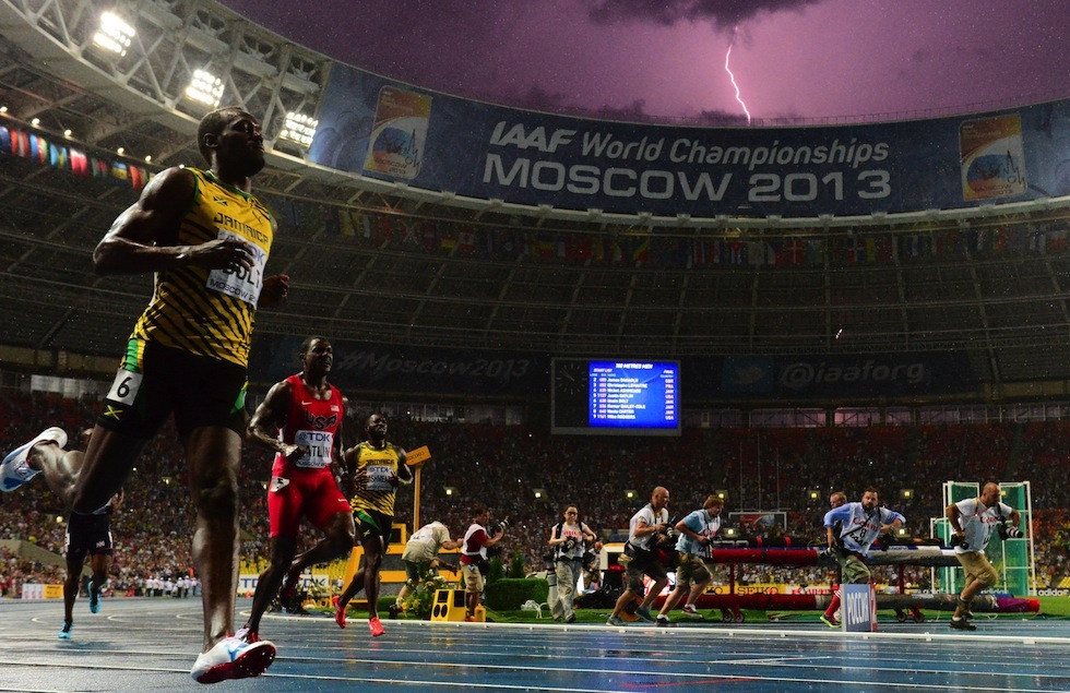 Il giamaicano Usain Bolt dopo aver vinto la medaglia d’oro nei 100 metri ai Mondiali di atletica leggera, 11 agosto 2013. Il cielo sullo sfondo è illuminato da un fulmine, in inglese bolt.