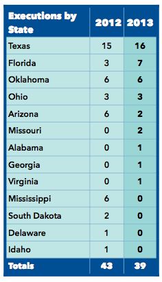 La tendenza al ribasso delle esecuzioni capitali è costante dal 1999. Nel 2013 sono state portate a termine 39 esecuzioni, cinque in meno delle 43 eseguite negli ultimi due anni. Lo stato che ha contribuito di più al bilancio è il Texas con 16 esecuzioni, seguito dalla Florida con 7 e dall’Oklahoma con 6. Quest’anno 80 persone sono state condannate a morte, 3 in più rispetto al 2012, ma comunque molte meno rispetto al 1996, quando furono 315. Il numero di persone nel braccio della morte ha continuato a diminuire dal 2001 a oggi: attualmente sono 3.108 in tutto il paese, rispetto ai 3.170 dello scorso anno. La maggior parte degli stati in cui la pena di morte è prevista non ha eseguito esecuzioni nel 2013.