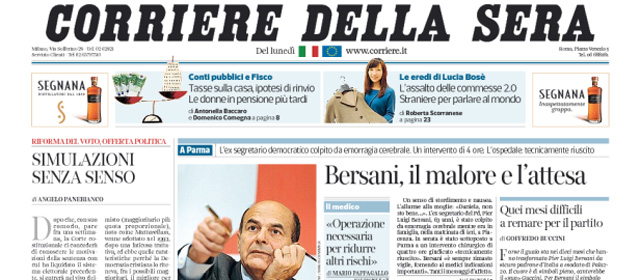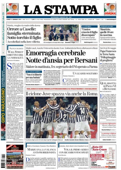 I giornali di oggi aprono tutti con le condizioni di salute dell’ex segretario del PD Pierluigi Bersani, operato ieri al cervello per un’emorragia cerebrale, sulla quale i primi giudizi dei medici sono ottimisti. Fa eccezione Repubblica, che titola invece su una sua intervista a Saccomanni nella quale il Ministro dell’Economia promette che nel 2014 le tasse caleranno. I giornali sportivi aprono con la vittoria sulla Roma da parte della Juventus, che allunga il suo vantaggio in testa al campionato.