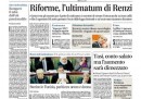 I temi di politica interna sono in apertura sui giornali di oggi: le ipotesi di riforma elettorale, sulla quale il Nuovo Centrodestra chiede al Partito Democratico di trovare un accordo nella maggioranza prima di coinvolgere gli altri partiti, il nuovo patto di governo che Letta vorrebbe chiudere con gli alleati, il piano del governo sulla spending review, di cui si occupa Repubblica, e l’attacco del Giornale al Ministro dell’Economia Saccomanni. Avvenire titola invece sul prossimo viaggio del Papa in Israele, mentre Europa rassicura sulle condizioni di salute di Bersani, e i quotidiani sportivi commentano i risultati della giornata di campionato, con le vittorie di Milan e Napoli.