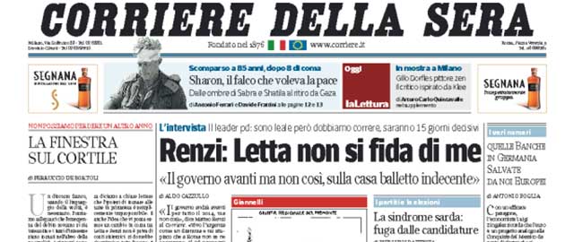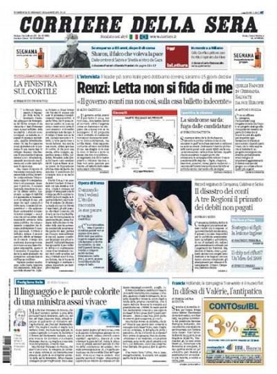 La morte di Ariel Sharon è l’unica notizia che è possibile trovare su tutte le prime pagine. Per il resto, in mancanza di una sola storia particolarmente forte, le altre si sparpagliano: chi apre col “caso De Girolamo”, chi con l’evoluzione dei rapporti tra Renzi e Letta, chi col crollo a Matera, chi con un’intervista a Saccomanni, chi con le tasse sulla casa. Vanno più sul sicuro i quotidiani sportivi, che si occupano dell’ultima giornata del girone di andata della Serie A.