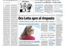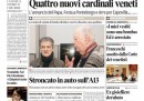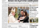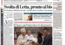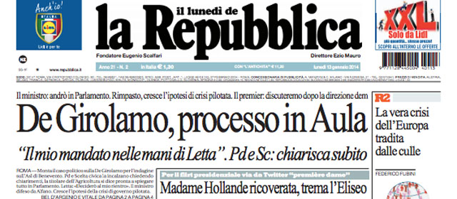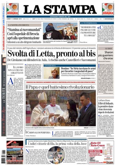 La maggior parte dei giornali di oggi apre con la situazione del governo, per il quale è dato per più probabile un rimpasto dopo le polemiche sulle telefonate intercettate del ministro De Girolamo. Il Corriere della Sera si occupa invece del Papa, che ha nominato 19 nuovi cardinali e battezzato il figlio di una coppia non sposata in chiesa, mentre i quotidiani sportivi commentano i risultati dell’ultima giornata di andata del campionato, con le vittorie di Juventus, Roma e Napoli in testa e la sconfitta del Milan a Sassuolo.