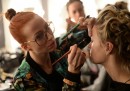 Il 14 gennaio è iniziata a Berlino la settimana della moda, nota anche come Mercedes-Benz Fashion Week dal nome del principale sponsor. Le sfilate, che si tengono davanti alla porta di Brandeburgo, termineranno il 19 gennaio e sono dedicate alle collezioni femminili del prossimo autunno e inverno. L’evento è nato nel 2007, è ancora piuttosto recente ma sta crescendo rapidamente, attirando soprattutto giovani stilisti internazionali. Come per tutte le sfilate, anche per quelle berlinesi la riuscita non si limita agli abiti, ma ha bisogno di moltissimi altri elementi come le scenografie, le luci, la musica, e del lavoro di artisti e artigiani. Le foto mostrano gli ultimi ritocchi alla pettinatura e al trucco delle modelle, le prove e i momenti prima di scendere in passerella, giusto il tempo di controllare la posta sullo smartphone o scattarsi un selfie. E poi ricevere gli applausi del pubblico, fatto di stilisti, giornalisti, appassionati di moda e colleghe, come Georgia May Jagger, figlia della supermodella Jerry Hall e di Mick Jagger.