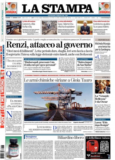 La tensione fra Renzi e Letta, le armi chimiche siriane in transito a Gioia Tauro, e La grande bellezza candidato all'Oscar