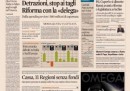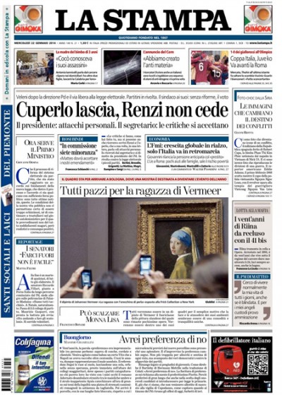 Per tutti i giornali di oggi l’apertura è dedicata alle dimissioni di Gianni Cuperlo da presidente del Partito Democratico, dopo la polemica nella riunione della direzione e l’accusa al segretario Renzi di mancanza di democrazia interna al partito. Fanno eccezione il Giornale e la Padania, che criticano il primo voto, da parte del Senato, sul disegno di legge che abolisce il reato di immigrazione clandestina. I quotidiani sportivi titolano sulla vittoria della Roma, che si qualifica alle semifinali di coppa Italia eliminando la Juventus.