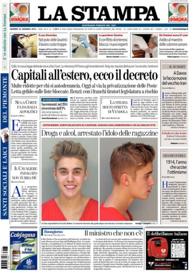 I giornali di oggi dedicano l’apertura a notizie diverse: la maggior parte titola sulle notizie economiche, come la sanatoria per le cartelle di Equitalia relative a multe e bolli, che potranno essere pagate fino al 28 febbraio senza interessi, il decreto del governo per il rientro dei capitali dall’estero, e il rapporto della Guardia di Finanza sull’evasione fiscale in Italia. Repubblica e l’Unità si occupano invece delle parole di Enrico Letta, che ha chiesto che la nuova legge elettorale non preveda le liste bloccate e annunciato di volersi occupare di una legge sul conflitto di interessi, mentre il Giornale e Libero aprono con la decisione della procura di Milano di indagare Berlusconi e i suoi avvocati per corruzione dei testimoni nel processo Ruby.