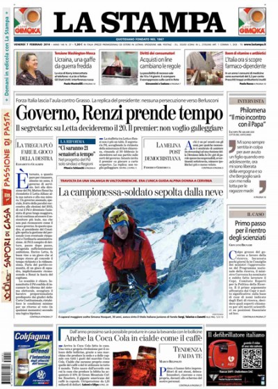 La direzione del PD sul destino del governo Letta, l'avvio delle Olimpiadi invernali, e la Coca Cola in cialde
