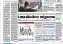 Quasi tutti i giornali di oggi si occupano in prima pagina di politica italiana. Repubblica e la Stampa dedicano il titolo principale alle parole di Matteo Renzi sul futuro del governo, mentre nel titolo del Corriere il protagonista è il presidente del Consiglio Enrico Letta, che «sfida Renzi sul governo». Sui giornali sportivi, la notizia di oggi è la vittoria del Napoli (3-1) nella partita contro il Milan, sabato sera.