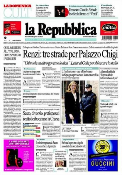 Quasi tutti i giornali di oggi si occupano in prima pagina di politica italiana. Repubblica e la Stampa dedicano il titolo principale alle parole di Matteo Renzi sul futuro del governo, mentre nel titolo del Corriere il protagonista è il presidente del Consiglio Enrico Letta, che «sfida Renzi sul governo». Sui giornali sportivi, la notizia di oggi è la vittoria del Napoli (3-1) nella partita contro il Milan, sabato sera.