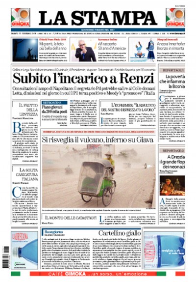 I giornali di oggi si occupano tutti in apertura delle dimissioni del Presidente del Consiglio Letta e dell’inizio delle consultazioni del Presidente della Repubblica per la formazione del nuovo governo, che saranno disertate dal Movimento 5 Stelle e dalla Lega e che dovrebbero portare forse già oggi all’incarico al segretario del PD Renzi.