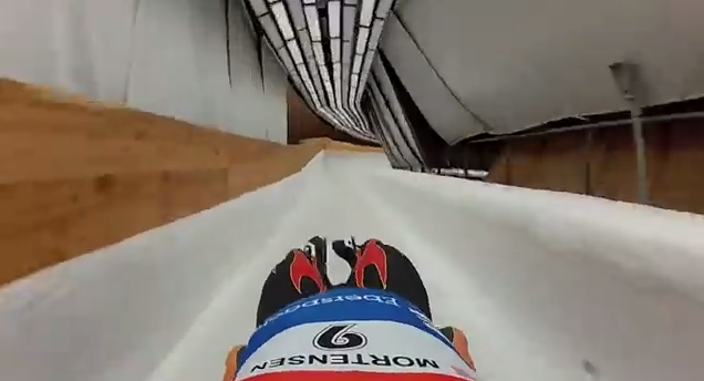 Lo slittinista Matthew Mortensen, della squadra statunitense di slittino doppio maschile, ha registrato questo video durante una delle discese di allenamento (circa un anno prima delle Olimpiadi) sulla pista di Sochi. La velocità raggiunta durante la discesa è di circa 130 chilometri orari.