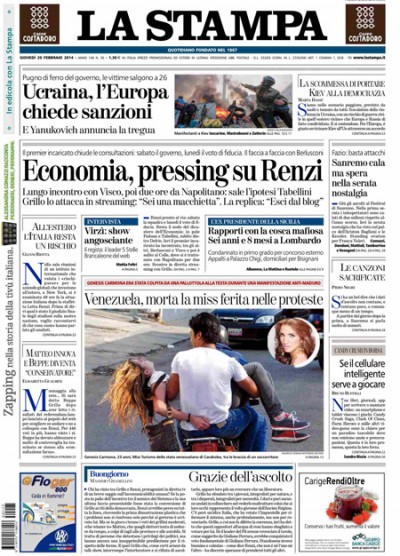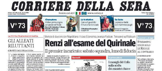 La giornata del Presidente del Consiglio incaricato Renzi, che ieri ha visto l’incontro con il Presidente della Repubblica Napolitano per fare il punto sulle trattative per la formazione del governo, lo scontro con Beppe Grillo trasmesso in streaming, e il confronto con Silvio Berlusconi e la delegazione di Forza Italia, è l’apertura di tutti i giornali di oggi. I quotidiani sportivi titolano con la sconfitta in casa del Milan contro l’Atletico Madrid nell’andata degli ottavi di finale della Champions League.
