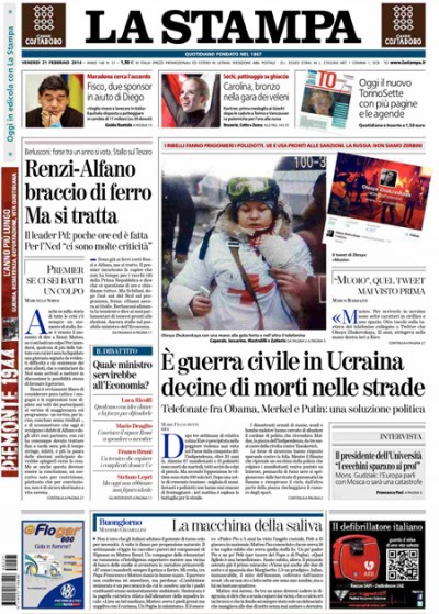 Le due notizie che si dividono l’apertura sui giornali di oggi sono gli scontri sempre più violenti in Ucraina, per i quali ormai quasi tutti i titoli parlano di “guerra civile”, e che hanno visto ieri la decisione dell’Unione Europea di applicare sanzioni nei confronti dei responsabili delle violenze, e la trattativa per la formazione del nuovo governo, che ieri ha visto nuovamente una tensione, che sembra comunque superata, fra Renzi e Alfano sui nomi dei ministri. I quotidiani sportivi titolano sulla medaglia di bronzo di Carolina Kostner nel pattinaggio di figura e sui risultati delle squadre italiane impegnate in Europa League.