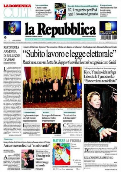 I quotidiani di oggi dedicano il titolo di apertura al nuovo governo, che ieri mattina ha giurato davanti al presidente della Repubblica. Si comincia a parlare di programmi: il Corriere della Sera titola “Renzi, giù le tasse sul lavoro”, mentre la Stampa è ancora più tecnica, con “Renzi, tagli a Irpef e Irap”. Altre due notizie compaiono su tutti i giornali: la liberazione e il ritorno a Kiev dell’ex premier ucraino Yulia Tymoschenko, che ieri ha lasciato l’ospedale dove era detenuta e ha parlato in serata ai manifestanti di piazza Indipendenza, e la vittoria di Arisa al festival di Sanremo.