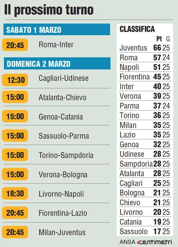 Nel posticipo serale della 25esima giornata del campionato di calcio di serie A, Napoli e Genoa hanno pareggiato 1 a 1: Higuain ha portato in vantaggio il Napoli al 18esimo del primo tempo, Calaiò ha pareggiato per il Genoa al 39esimo del secondo tempo. Nell’altro posticipo di oggi Parma e Fiorentina hanno pareggiato 2 a 2: per il Parma hanno segnato Cassano (39esimo del primo tempo) e Amauri su rigore (sesto minuto del secondo tempo), mentre per la Fiorentina hanno segnato Cuadrado (41esimo del primo tempo) e Fernandez (40esimo del secondo tempo). Ci sono stati ben tre giocatori espulsi: Munari per il Parma e Diakité e Borja Valero per la Fiorentina. Nel prossimo turno di campionato si giocheranno partite molte importanti e attese: il primo marzo si giocherà Roma-Inter, il giorno dopo Milan-Juventus.