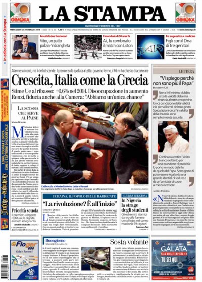 Il voto di fiducia da parte della Camera per il governo Renzi è in apertura sulla maggior parte dei giornali di oggi, che sottolineano anche le parole del nuovo premier che dichiara di non voler prendere ordini dall’Unione Europea, nel giorno in cui quest’ultima taglia le stime sulla crescita in Italia, prevedendo solo un +0,6% nel 2014. Sui giornali sportivi intanto impazzano le polemiche contro gli arbitri, questa volta con protagonista la Fiorentina.