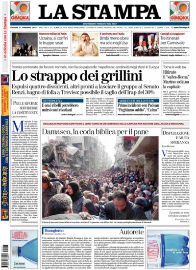 Su quasi tutti i giornali di oggi l’apertura è dedicata alla decisione del Movimento 5 Stelle, dopo un’assemblea dei parlamentari e il voto dei militanti online, di espellere 4 senatori “dissidenti”, decisione che ha provocato malumori nei gruppi parlamentari e la minaccia di lasciare il partito da parte di una decina di parlamentari. Il Messaggero e la Padania invece, con punti di vista opposti, si occupano del ritiro da parte del governo del decreto “salva Roma”, che rischiava di non essere approvato in tempo dalle camere.