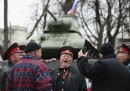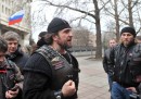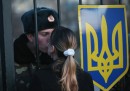 Le fotografie che sono arrivate dalla Crimea negli ultimi sei giorni sono molto particolari e raccontano cose e dettagli che a molti giornalisti sono sfuggiti. Anzitutto, la “normalità” con cui la popolazione locale sembra accogliere la presenza di soldati armati e blindati in giro per le strade delle città della Crimea. Poi tante facce: alcune minacciose di uomini armati che non si capisce di che esercito facciano parte, altre bizzarre che sembrano arrivare da un altro tempo. Negli ultimi sei giorni in Crimea si sono visti i cosacchi, tutti in fila a farsi fotografie; i poliziotti Berkut responsabili della repressione dei manifestanti anti Yanukovych, che mentre a Kiev si inginocchiavano per farsi perdonare in Crimea venivano accolti come degli eroi; i motociclisti “Lupi della notte”, gli amici del presidente Putin che rifiutano “qualunque legge scritta e non scritta”, e che vogliono ricostruire “la grandezza della Russia”; milizie locali di autodifesa, confuse per militari russi ma con equipaggiamento che arriva chissà da dove; e poi qualche militare ucraino, come quelli che sono bloccati da giorni nelle basi della Crimea senza volersi arrendere e che baciano le fidanzate attraverso le sbarre dei cancelli d’ingresso.