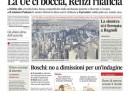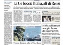 La maggior parte dei giornali di oggi apre con il richiamo dell’Unione Europea all’Italia per lo squilibrio eccessivo dei suoi conti pubblici e la richiesta di ridurre il debito e favorire maggiormente la crescita economica. Il Giornale apre invece sull’indagine a cui è sottoposto il giudice Esposito, il Fatto titola sull’intervento alla Camera del ministro Boschi, che ha detto che non saranno chieste le dimissioni ai sottosegretari che hanno ricevuto avvisi di garanzia, il Manifesto si occupa della presentazione della lista Tsipras per le elezioni europee, mentre Pagina99 apre con la multa dell’antitrust a due case farmaceutiche per aver favorito la vendita di farmaci a prezzi alti. I quotidiani sportivi si occupano della sconfitta dell’Italia con la Spagna in amichevole, e dell’ipotesi di vendita del Milan circolata da ieri.