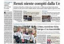 La maggior parte dei giornali di oggi apre con la risposta del Presidente del Consiglio Renzi, che ha detto che l’Italia “sa cosa deve fare”, al richiamo dell’UE all’Italia sui conti pubblici. Il Giornale, l’Unità e il Manifesto titolano invece sulla bocciatura alla Camera dell’emendamento che prevedeva l’alternanza di genere nella composizione delle liste nella nuova legge elettorale, mentre Pagina99 si occupa della decisione della Crimea di indire un referendum per il 16 marzo per unirsi alla Russia.