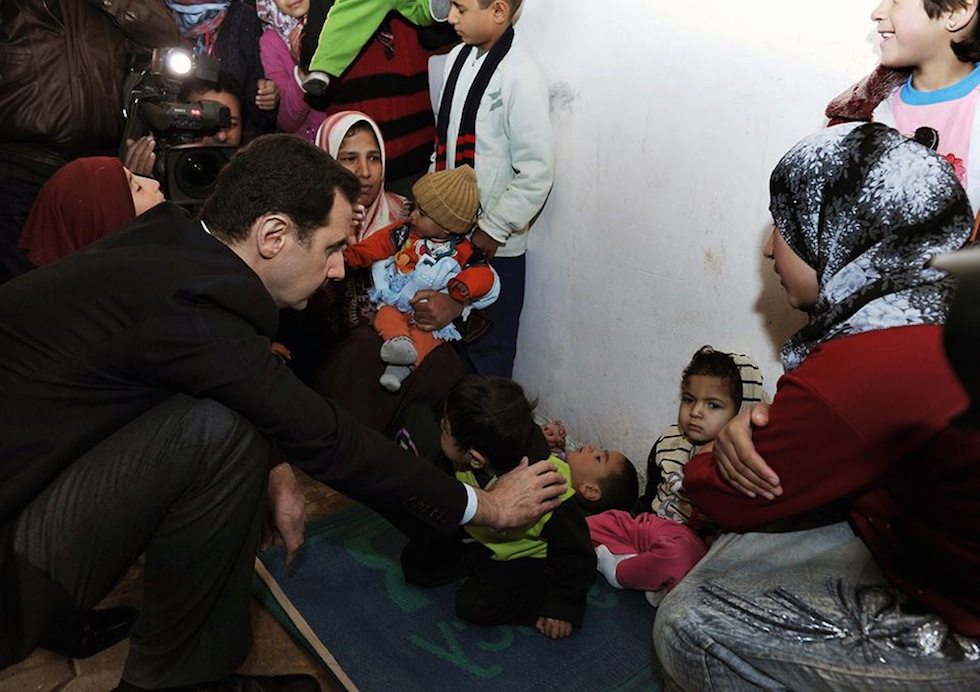Il presidente siriano Bashar al Assad ha visitato oggi alcuni sfollati siriani ad Adra, città a 20 chilometri a nordest di Damasco, in una delle sue rare apparizioni pubbliche fuori dalla capitale. La televisione di stato siriana ha detto che Assad ha «ascoltato i bisogni» degli sfollati e ha detto loro che il suo governo avrebbe continuato ad assicurare i servizi essenziali fino a che non sarebbero tornati nelle loro case ad Adra o in altre zone della Siria. Le fotografie sono state diffuse dagli account ufficiali di Assad sia su Facebook che su Twitter.