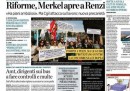 I quotidiani di oggi scelgono soprattutto tra due temi principali: il primo è la riforma del mercato del lavoro di Matteo Renzi, il cosiddetto Jobs Act, che il leader della CGIL Susanna Camusso ha criticato perché creerebbe maggior precarietà. L’altra, che riguarda ancora la politica italiana, è l’annuncio di Silvio Berlusconi di volersi candidare alle elezioni europee, nonostante le condanne giudiziarie. Diversi quotidiani, non solo sportivi, parlano in prima pagina della dell’ex presidente del Bayern Monaco Uli Hoeness, condannato a tre anni e mezzo di carcere per avere evaso le tasse per 27 milioni di euro.