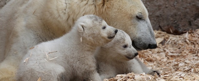 Questa mattina lo zoo di Hellabrunn, a Monaco, in Germania, ha presentato per la prima volta al pubblico due gemelli di orso polare – una femmina e un maschio – nati lo scorso dicembre da Giovanna, 7 anni, e Yoghi, 14 anni. Il direttore dello zoo, Andreas Knieriem, ha detto che i cuccioli sono in buona salute, e quando sono stati pesati in febbraio la femmina aveva raggiunto i 5,4 chili, il maschio 4,6 chili. Per ora i funzionari dello zoo hanno deciso di lasciare Yoghi separato dal resto della famiglia, per tutelare i cuccioli (il timore è che li uccida e se li mangi, cosa non rara). Yoghi si trova ora allo zoo di Stoccarda, che a sua volta cercava un orso polare maschio da accoppiare a Corinna, orso polare femmina il cui compagno era morto poco tempo fa dopo avere ingerito uno zaino e una giacca.