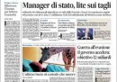 I quotidiani italiani dedicano il titolo principale a temi diversi, questa mattina: molti danno spazio alle dichiarazioni dell’amministratore delegato del gruppo Ferrovie dello Stato, Mauro Moretti, che ha criticato l’idea del governo di tagliare gli stipendi dei manager pubblici. Anche Repubblica titola su una critica al governo, ma questa volta sul giudizio dell’Unione Europea sulla situazione economica italiana. Diversi quotidiani danno molto spazio in prima pagina alle parole del papa, che ha invitato i mafiosi al pentimento.