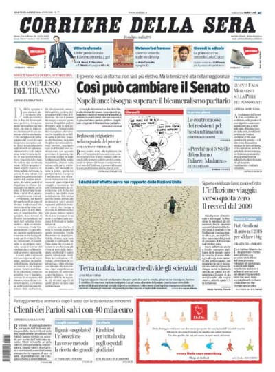 Praticamente tutti i giornali dedicano il loro titolo di apertura alla riforma del Senato e della Costituzione approvata ieri dal Consiglio dei ministri, e alcuni scelgono anche un taglio preciso: chi scrive di “rasoiata” di Renzi, chi di Renzi che “rischia tutto”, chi addirittura di “fuori i tromboni”. Tra le notizie sportive, il risultato dell’Inter è su parecchie prime pagine: si è fatto rimontare due gol dal Livorno e la Gazzetta dello Sport titola parlando di “vergogna”, sostenendo che la definizione arrivi dallo stesso allenatore dell’Inter.