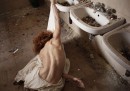 Paolo Porto è un fotografo dell’Aquila che nella sua carriera ha fatto cose diverse, ha vinto una volta un premio dell’importante concorso World Press Photo (ma non gli è servito a niente, dice lui) e ha spesso lavorato col movimento di corpi umani, di attori, di ballerini, di modelli e modelle. Dal terremoto dell’Aquila del 2009 – saranno passati cinque anni il 6 aprile – ha provato a mostrare com’è la sua città con scelte creative e di reportage insieme, associando modelle e ambienti devastati, appuntellati, trascurati, tuttora terremotati. Per cercare – come dice esplicitamente – di attirare l’attenzione sull’Aquila, dove l’attenzione arriva ritualmente a ogni anniversario e sparisce poco dopo: mostrando i luoghi intorno ai soggetti e introducendo – letteralmente – i soggetti nei luoghi (“porta un nuovo vivere all’interno dei luoghi e degli spazi”, spiega Rai Arte) indicati poi su una mappa.
