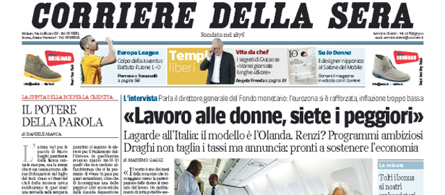 Non c’è una notizia che spicca sulle prime pagine di oggi: si va dal destino del governo Renzi e delle riforme, con le tensioni in Forza Italia nell’attesa del pronunciamento della magistratura sull’esecuzione della condanna di Berlusconi, ai dettagli sui provvedimenti economici allo studio, all’approvazione definitiva della legge che riforma le province (sulla quale però i giudizi sono contrastanti, leggendo l’Unità e il Giornale). Il Corriere della Sera titola invece con un’intervista al direttore generale del Fondo Monetario Lagarde, il Manifesto e il Mattino si occupano dell’arresto dell’ex coordinatore regionale campano del PdL Nicola Cosentino, mentre i quotidiani sportivi aprono sulla vittoria della Juventus a Lione nell’andata dei quarti di finale di Europa League.
