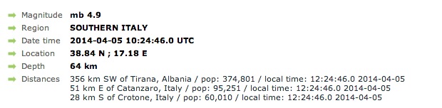 #terremoto Ml:5.0 2014-04-05 10:24:45 UTC Lat=38.79 Lon=17.26 Prof=65.7Km Prov=Southern Italy http://t.co/DLiAmcLe4x