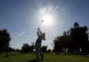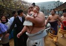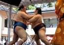 Ogni anno il tempio shintoista di Yasukuni a Tokyo – uno dei più suggestivi di tutto il Giappone – ospita un torneo di sumo preceduto da un lungo cerimoniale durante il quale i lottatori tengono in braccio dei neonati per celebrare un antico rito shintoista. Migliaia di persone arrivano da tutto il Giappone per assistere a questa festa. Tra le foto sportive più belle della settimana ce n’è anche una scattata durante una sessione di allenamento di paracadutismo sportivo alla galleria del vento verticale di Bedford, in Inghilterra: si tratta di un tunnel alto 36 metri, costruito nel 1950, come area di esercitazioni per i militari dell’aeronautica inglese. C’è anche uno scatto particolarmente suggestivo che tiene insieme nella stessa inquadratura una macchina di Formula 1 e un elicottero sullo sfondo.
