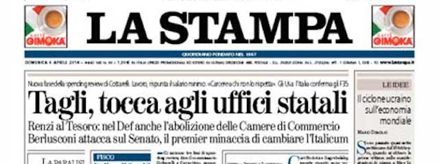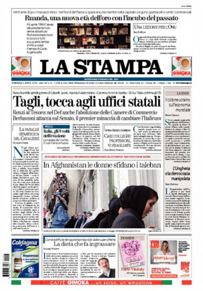 Molti giornali di domenica 6 aprile aprono con lo scontro tra Berlusconi e Renzi sulla riforma del Senato, e si parla anche dei contenuti del Documento di Economia e Finanza (DEF) che in settimana sarà presentato dal governo. La Stampa apre con una nuova fase della “spending review” che dovrebbe “toccare agli uffici statali”, e riprende le critiche di Berlusconi riguardo le riforme. Anche il Sole 24 Ore parla di un piano di “tagli” da 5 miliardi. Il Mattino apre con un documento dell’agenzia delle entrate sull’evasione fiscale in Italia, mentre i principali quotidiani sportivi aprono con il pareggio dell’Inter in casa contro il Bologna.