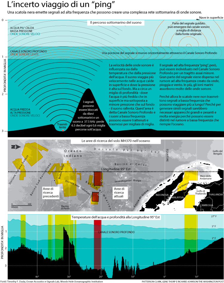 Trovare il punto esatto in cui si trovano le scatole nere non è semplice. I segnali a ultrasuoni che inviano possono viaggiare per diversi chilometri in acqua, dove però subiscono deviazioni a seconda delle correnti di acqua più calda o più fredda che incontrano. I microfoni trainati dalle navi hanno una buona sensibilità, ma indicano aree abbastanza generiche entro le quali è poi necessari stringere il campo. Le variabili a cui sono soggetti i segnali di questo tipo – “ping” – sono esposte in questa spiegazione grafica (cliccare sull’immagine per ingrandire).
