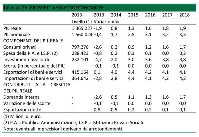 Il governo stima una crescita del PIL dello 0,8 per cento per il 2014, inferiore alle previsioni del precedente governo Letta, “con un graduale avvicinamento al 2 per cento nei prossimi anni”. L’indebitamento netto nel 2014 dovrebbe fermarsi al 2,6 per cento del PIL, per poi scendere all’1,8 nel 2015 e allo 0,9 nel 2016. L’avanzo primario in termini nominali – cioè al netto degli interessi sul debito, senza i quali l’Italia incasserebbe più di quanto spende – aumenterà progressivamente, raggiungendo il 5,0 per cento nel 2018. “Il rapporto debito/PIL inizierà a ridursi a partire dal 2015”, dice il governo.