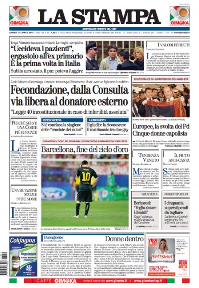 Per la maggior parte dei quotidiani di oggi la notizia in apertura è la decisione con cui la Corte Costituzionale ha cancellato la parte della legge 40 che non consentiva la fecondazione eterologa alle coppie sterili. L’altra notizia su cui aprono diversi giornali è l’udienza prevista per oggi a Milano per decidere se affidare Silvio Berlusconi ai servizi sociali per scontare la sua pena definitiva, mentre Libero critica il governo sulla riduzione dell’IRPEF per i lavoratori dipendenti, il Fatto attacca il Quirinale per il suo apparato di sicurezza, giudicato eccessivo, e i quotidiani sportivi titolano sull’eliminazione del Barcellona nei quarti di finale di Champions League.