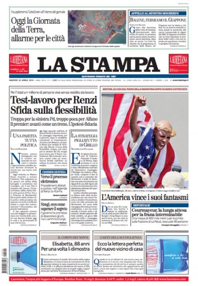 Ci sono notizie diverse in apertura sui quotidiani di oggi: molti si occupano del decreto del governo sul lavoro, che arriva oggi all’esame della Camera e sul quale ci sono divisioni fra il PD e Scelta Civica e NCD, tanto che prende corpo l’ipotesi che il governo chieda la fiducia. Repubblica titola invece su un “piano segreto” del governo per ridurre l’investimento sugli F35, il Corriere della Sera apre sullo spesometro che entra in vigore oggi, consentendo al fisco di controllare le spese per gli acquisti degli italiani, il Giornale e la Padania attaccano il governo per gli sbarchi degli immigrati, e il Messaggero intervista il ministro dell’interno Alfano sulla sicurezza a Roma.