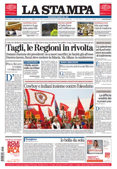 Quasi tutti i giornali di oggi si occupano in apertura della decisione del governo di chiedere la fiducia alla Camera sul decreto sul lavoro, dopo le tensioni con il Nuovo Centro Destra che però minaccia battaglia al Senato dove i suoi numeri sono necessari all’approvazione. Il Secolo XIX apre invece con la decisione del governo di togliere il segreto di stato sugli atti relativi alle stragi in Italia, la Stampa titola sulle proteste delle Regioni per i nuovi tagli richiesti, e il Messaggero si occupa invece dei tagli ai bilanci dei Ministeri, mentre il Fatto analizza il piano di Etihad per il salvataggio di Alitalia.