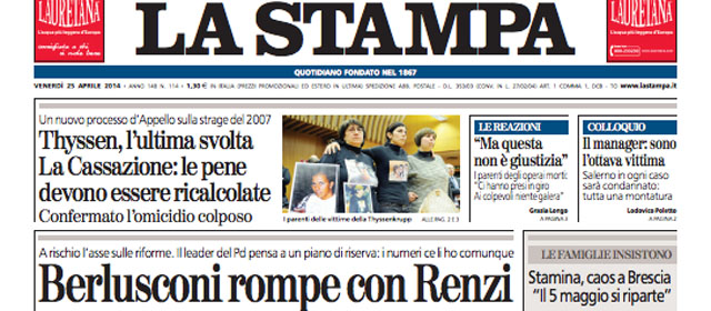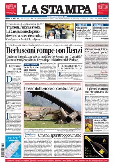 Quasi tutti i giornali di oggi aprono con il ritorno in televisione di Silvio Berlusconi, che nella puntata di ieri sera di Porta a Porta ha attaccato le riforme della legge elettorale e del Senato sulle quali aveva trovato un accordo con il Presidente del Consiglio Renzi, da lui definito un “simpatico tassatore”. L’altra notizia politica che ha molto spazio sulle prime pagine è la decisione del Presidente della Repubblica Napolitano di firmare il decreto sulla riduzione dell’IRPEF dopo aver convocato il Ministro dell’Economia Padoan per chiedere chiarimenti sul provvedimento. I quotidiani sportivi titolano sulla sconfitta della Juventus con il Benfica nell’andata delle semifinali di Europa League.