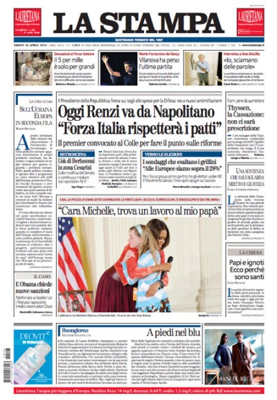 Sono due le notizie che si dividono le aperture dei giornali di oggi: l’incontro di oggi al Quirinale fra il Presidente della Repubblica Napolitano e il Presidente del Consiglio Renzi per discutere delle riforme, dopo le tensioni con Forza Italia per le parole di Berlusconi che ha messo in dubbio il suo appoggio, e la situazione sempre più tesa in Ucraina con il sequestro da parte dei filorussi di 13 osservatori OSCE, accusati di essere spie. Su quasi tutte le prime pagine ampio spazio è dedicato alla cerimonia di domani a Roma per la canonizzazione dei papi Giovanni XXIII e Giovanni Paolo II, a cui il Secolo XIX dedica una doppia prima pagina, mentre il Fatto e il Tempo titolano sulle parole di Napolitano sui due marinai detenuti in India. I quotidiani sportivi aprono sulla vittoria della Roma con il Milan con un gran gol di Pjanic e sulla morte dell’ex allenatore del Barcellona Vilanova.