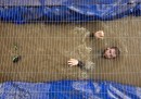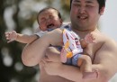 In un’altra foto c’è un lottatore di sumo che tiene in braccio un bambino che piange, secondo un rituale giapponese – il Naki Sumo, antico più di 400 anni – che si tiene ad aprile al tempio Sonsoji di Tokyo e che sembra piuttosto crudele, visto da qui: i lottatori di sumo cercano di far piangere i loro figli, e per riuscirci vengono aiutati da alcuni concelebranti che indossano delle maschere mostruose per spaventarli. Il loro pianto, nel contesto di questa celebrazione, è considerato un segnale di buon augurio e significa che cresceranno forti e in buona salute.