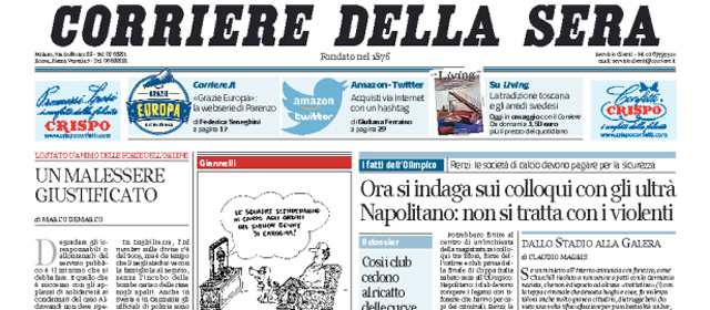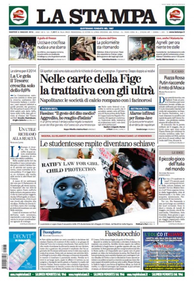 Quasi tutti i giornali di oggi si occupano ancora in apertura delle polemiche dopo gli scontri di sabato scorso fra tifosi prima della finale di coppa Italia fra Napoli e Fiorentina: ieri è intervenuto il Presidente della Repubblica Napolitano, richiamando le società di calcio a rompere ogni rapporto con gli ultras, mentre il Presidente del Consiglio Renzi chiede che i costi per mantenere l’ordine pubblico negli stadi siano a carico delle società. Fanno scelte diverse il Manifesto, che apre sul congresso della CGIL che inizia oggi a Rimini, l’Osservatore Romano che chiede pace per l’Ucraina, e Libero e il Giornale, che vanno all’attacco della sinistra in vista delle elezioni europee.